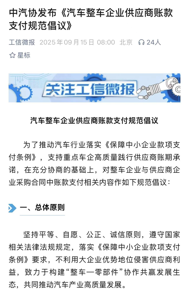 5月底,中汽协曾发文称,以无序"价格战"为主要表现形式的"内卷式"竞争,是行业效益下降的重要因素,严重影响企业正常经营,冲击产业链供应链安全,把产业发展带入恶性循环。随后,中国一汽、东风公司、广汽集团等10余家主流车企宣布将支付供应商货款的账期统一至60天内,引发行业内外关注。