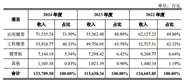 从产品上看,元创股份主要拥有农用履带、工程履带、履带板等产品,其中农用履带产生的销售收入分别为62127.23万元、55562.48万元、71535.24万元,分别占当期主营业务收入的49.86%、48.89%、53.5%,为公司最重要的产品,具体情况如下: