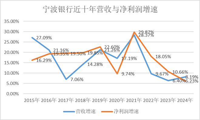 长期以来,宁波银行在上市银行中保持了很高的成长性,2016-2025年十年间,宁波银行营收增长204%,净利润增长276%,远高于招行的业绩增长。招行近十年营收与净利润增长分别为61.48%和142%。