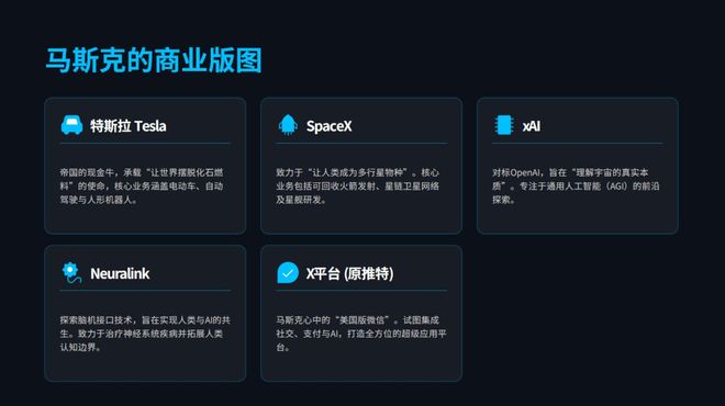 - 特斯拉:做电动车、自动驾驶、人形机器人。帝国的现金牛,也是马斯克“让世界摆脱化石燃料”的核心载体。