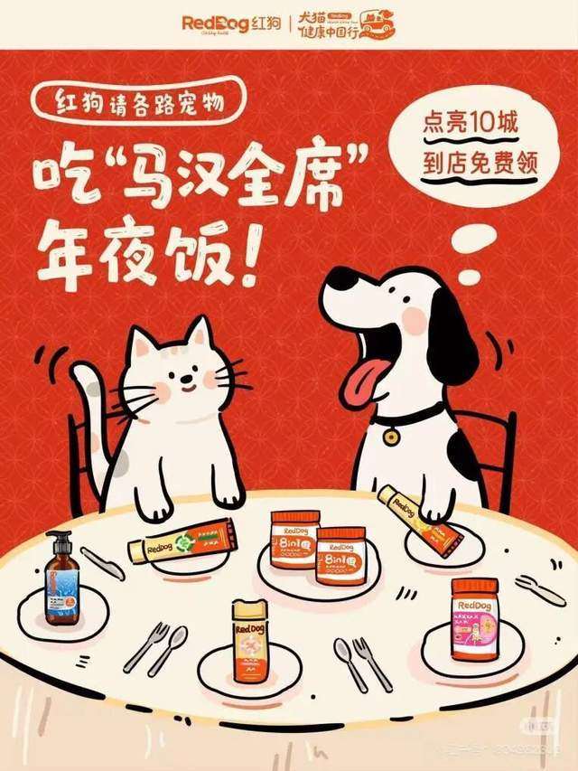 以红狗推出的"宠物年夜饭"为例,虾油、营养膏等产品在"人宠同源"的理念下被赋予了春节语境,年夜饭不只是给宠物吃的,更是一种情绪象征:即便主人不在身边,宠物也一起"过了年"。同时,还联合10地10家指定门店、发起拍照打卡、领取宠物新春年夜饭的活动,盘活线下门店、增强品牌效应。