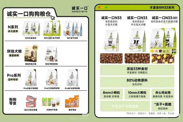 随着市场不断分化,普通粮的空间被压缩,高端、有机、天然的产品成为增长主力。以诚实一口为代表的国货宠粮品牌,通过公开配方逻辑、明确原料来源,并把价格控制在可承受区间内,降低了养宠人的决策焦虑。