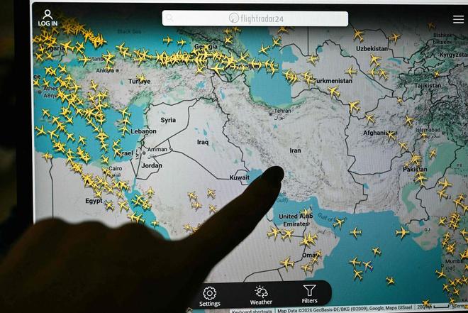 当地时间2026年3月1日,法国巴黎,一名民众指向Flightradar 24网站页面,页面显示民用航班避开伊朗和伊拉克空域。视觉中国 图
