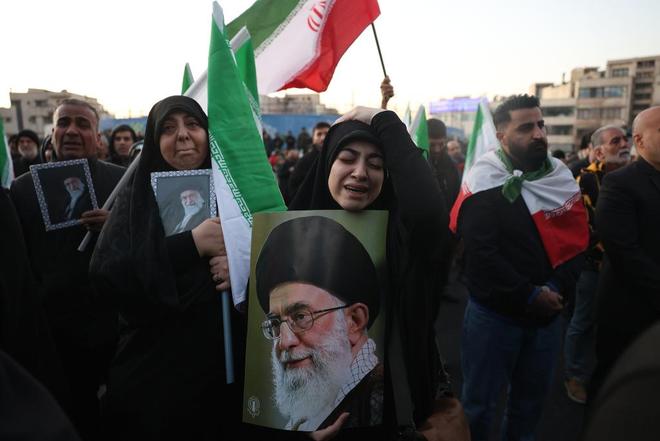 当地时间2026年3月1日,伊朗德黑兰,民众手持伊朗最高领袖阿里·哈梅内伊的照片悼念其逝世。视觉中国 图