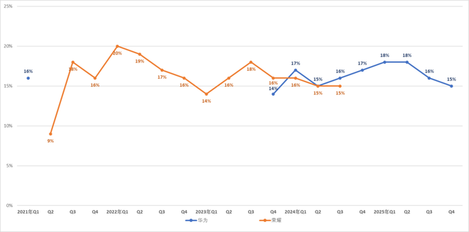 在投资者的估值逻辑中,传统手机硬件厂商和AI终端生态公司有着完全两种不同的市盈率故事。如果荣耀继续仅被定义在存量市场肉搏的硬件卖场,其估值空间将极度受限,尤其是在华为强势归来导致其市场份额下滑的背景下,即便Robot Phone面临种种考验,荣耀仍坚持将其推向台前的战略核心在于:高溢价的“具身智能”叙事。