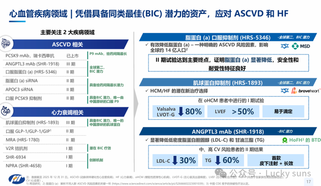 如2025年9月,公司与美国Braveheart Bio达成对外授权的心肌肌球蛋白抑制剂HRS-1893,是一款高选择性心肌肌球蛋白小分子抑制剂,用于治疗肥厚型心肌病。因传统治疗方案存在疗效不佳或无法耐受等局限,存在巨大未满足临床需求。