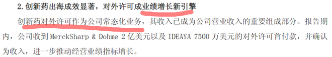 恒瑞也在财报中提到,创新药对外许可已成为公司常态化业务,成为业绩增长新引擎。