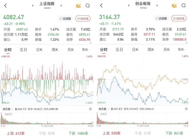 至收盘,上证综指跌0.98%,报4082.47点;科创50指数跌0.49%,报1381.56点;深证成指跌0.75%,报13917.75点;创业板指跌1.41%,报3164.37点。