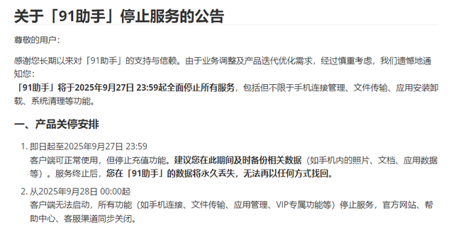 91助手称,因业务调整与产品迭代优化需求,91助手应用将于9月27日起全面停止所有服务,包括但不限于手机连接管理、文件传输、应用安装卸载、系统清理等核心功能。