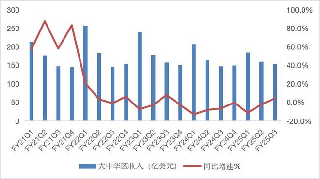 如果拉长周期,可以发现,实际上23年下半年开始,受出货量持续下跌的影响,苹果的大中华区收入就开始呈现负增长。截至25财年第二财季,苹果已经连续7个季度维持负增长,大中华区也成了苹果唯一持续出血的市场。