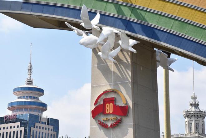 8月31日,在北京复兴门桥,彩虹门立柱新增纪念活动标识,和平鸽展翅翱翔。