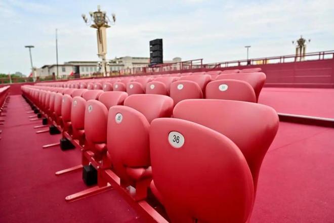 为了让更多群众到现场观礼,广场上搭建了临时观礼台,位置尽可能靠近长安街,以更好满足群众观礼体验。临时观礼台呈“众”字形梯级布局,座椅颜色分别为丰饶金、城墙红和橄榄绿。特别是红色座椅,不仅与马路对面的天安门城墙呼应,也与广场周围的80面红旗以及红色的花坛布置相得益彰。