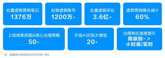 如账号治理,是从源头打击虚假营销,主要包括“伪素人”账号和“众包”账号,团队会捕捉账号的“异常行为”,并结合内容、关联违规品牌等多维度进行识别,半年封禁1200多万虚假账号;而内容治理,便是要清理夹带广告的笔记、自问自答的假评论,通过升级笔记和评论识别大模型,半年内小红书累计处置1376万篇虚假营销笔记和超3.6亿条虚假评论。