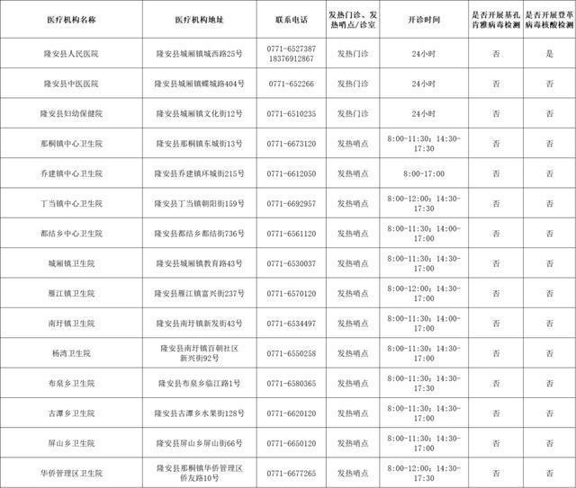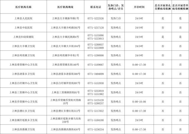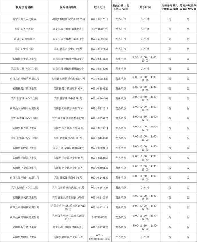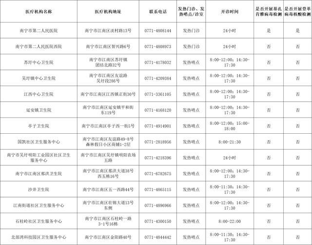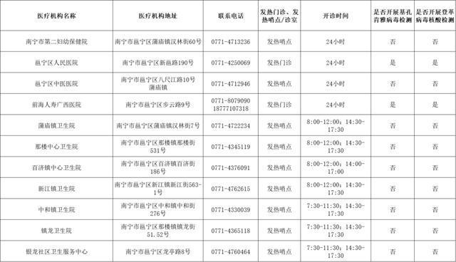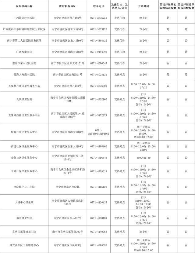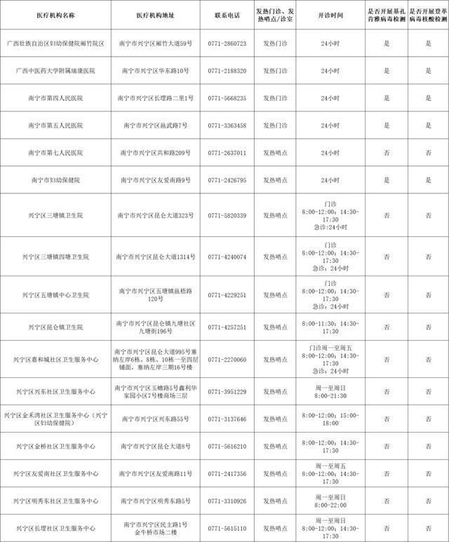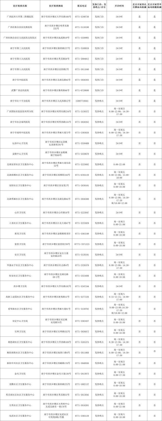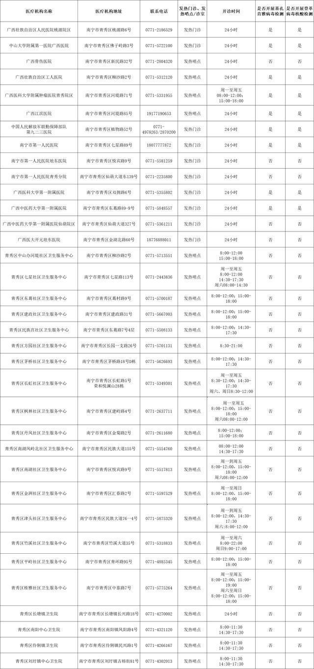 (原题为《南宁市医疗机构发热门诊、哨点设置与蚊媒病毒核酸检测信息一览表》)