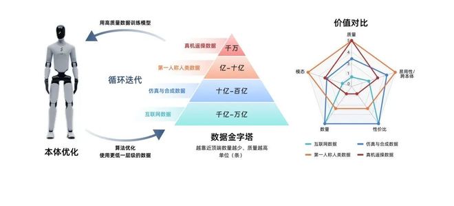 第二个是数据金字塔,底层是互联网数据,规模最大,提供语义和常识先验;再往上是仿真/合成数据,适合预训练、策略搜索和并行试错;再往上是以第一人称人类数据为代表的多模态真实数据;最顶层则是真机遥操数据。越往上,数据量越小,但越接近真实任务、真实接触和真实控制闭环。