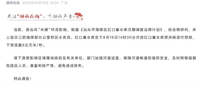同时,潮南区红口輋水库工程管理处也于19日12时根据《汕头市潮南区红口輋水库汛期调度运用计划》,经会商研判,并上报区三防指挥部办公室和区水务局,红口輋水库定于9月19日14时00分开启红口輋水库泄洪闸进行预排,下泄流量8立方米/秒。