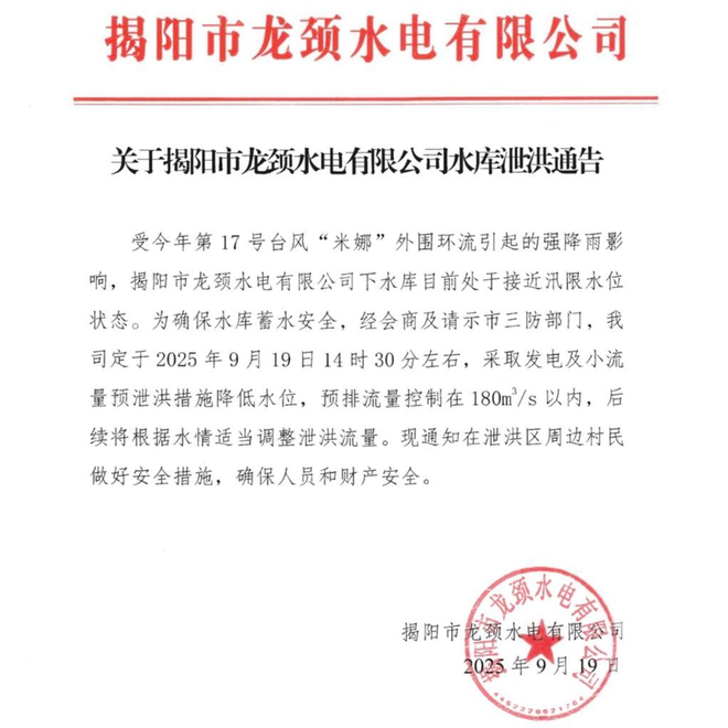 据“潮南在线”消息,汕头市潮南区秋风水系工程管理处 2025年9月19日11时00分根据《秋风水库汛期调度运用计划》,经会商研判,并上报区三防指挥部办公室和区水务局,秋风水库定于9月19日13时00分开启圆山副坝泄洪闸进行预排,下泄流量30立方米/秒。