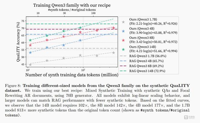 该技术对中小参数模型格外友好,8B及以下的轻量模型,仅需少量高质量合成数据,就能达到甚至超越传统RAG的效果,无需堆砌海量算力,不用搭建复杂的检索系统,大幅降低了企业落地门槛,让中小厂商也能轻松布局垂直领域AI。