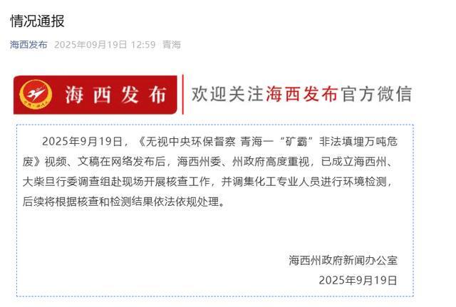 据“海西发布”消息,2025年9月19日,《无视中央环保督察 青海一“矿霸”非法填埋万吨危废》视频、文稿在网络发布后,海西州委、州政府高度重视,已成立海西州、大柴旦行委调查组赴现场开展核查工作,并调集化工专业人员进行环境检测,后续将根据核查和检测结果依法依规处理。