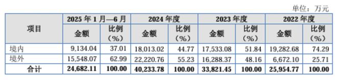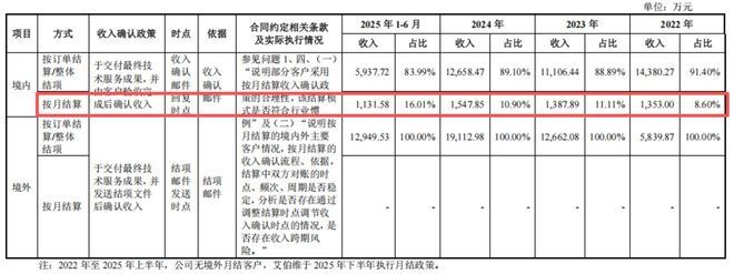 数据显示,境外业务已成为公司核心收入来源:2022年至2025年上半年,境外主营业务收入占比分别为25.71%、48.16%、55.23%、62.99%,占比持续攀升。若部分境外客户后续对服务成果提出异议,可能导致收入跨期或冲减风险。