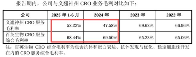 2022年至2025年上半年,百英生物CRO服务综合毛利率分别为65.06%、65.23%、69.5%、68.44%,而同行可比公司义翘神州同期CRO服务毛利率为66.96%、69.62%、47.58%、52.22%。2024年起,两者变动趋势完全相反,百英生物毛利率反超义翘神州20余个百分点,且持续维持高位。