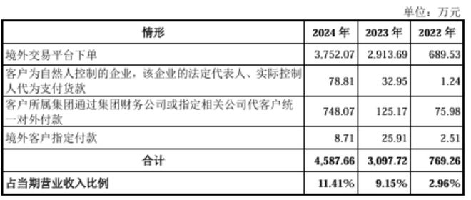 这些回款主要来自境外交易平台、客户集团财务公司代付及法定代表人代付等情形,部分还存在未签订代付协议的情况。