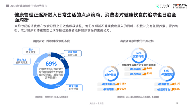 CBNData发布的《健康产业消费趋势发展报告》显示,2024年,69%的受访者在日常饮食中有意识减少不利健康成分的同时,增加有益营养的摄入。低门槛、轻负担、愉悦性等积极体验,已成健康消费的重要价值之一。