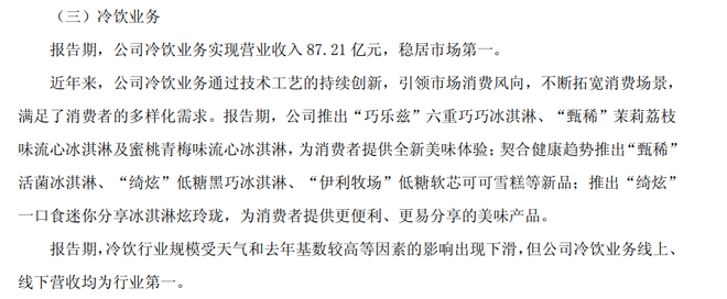 一般而言,消费者更倾向于在炎热夏季选购冷冻饮品,进入寒冷的秋冬季后,对这类产品的购买意愿会显著降低。比如,2024年财报显示,伊利冷饮业务营收87.21亿元,同比骤降18.4%,主要系"天气和去年基数较高等因素的影响"。