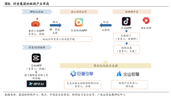 产业链的下游是"巨量引擎",国内短剧最主要的投流渠道。巨量引擎整合了字节跳动旗下的海量营销资源,结合算法模型、智能分发以及火山引擎云服务优势,为红果短剧提供充足的商业化资源以及买量环节的降本增效。