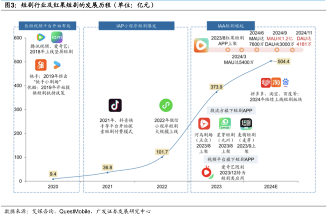 在红果入场之前,短剧从长视频平台起步,到短视频平台布局,再到小程序崛起,一直主打IAP模式(应用内付费)。在抖音/快手等平台投放信息流广告吸引用户,用户点击后跳转至小程序或APP,在免费观看的前几集下钩子,吸引用户付费解锁后续剧情,通常采用1元内单集解锁或79/99元打包全集的模式。