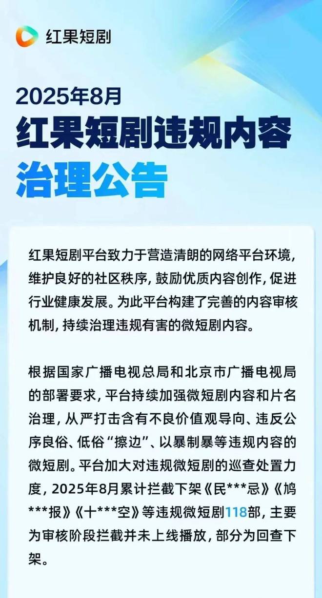 2024年,监管进一步细化、常态化。2024年12月26日,红果短剧官方账号发文称,红果短剧接受了广电主管部门的约见,高度重视问题,对于发现的违规内容,立即采取下线等措施。