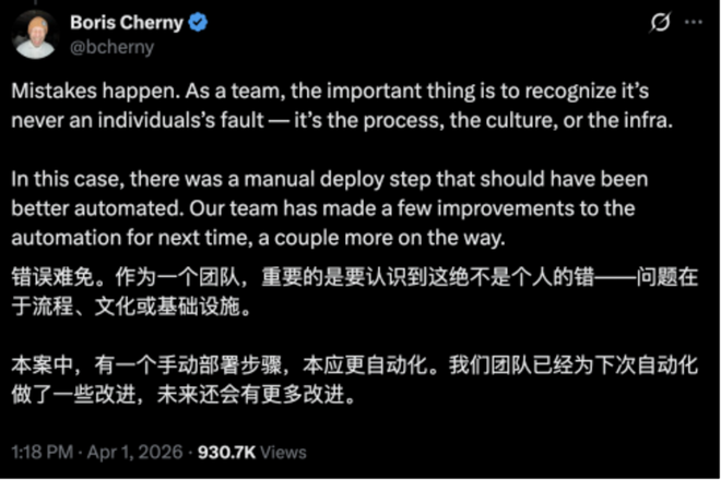 Claude Code负责人Boris Cherny出面回应,称这是一次意外操作。