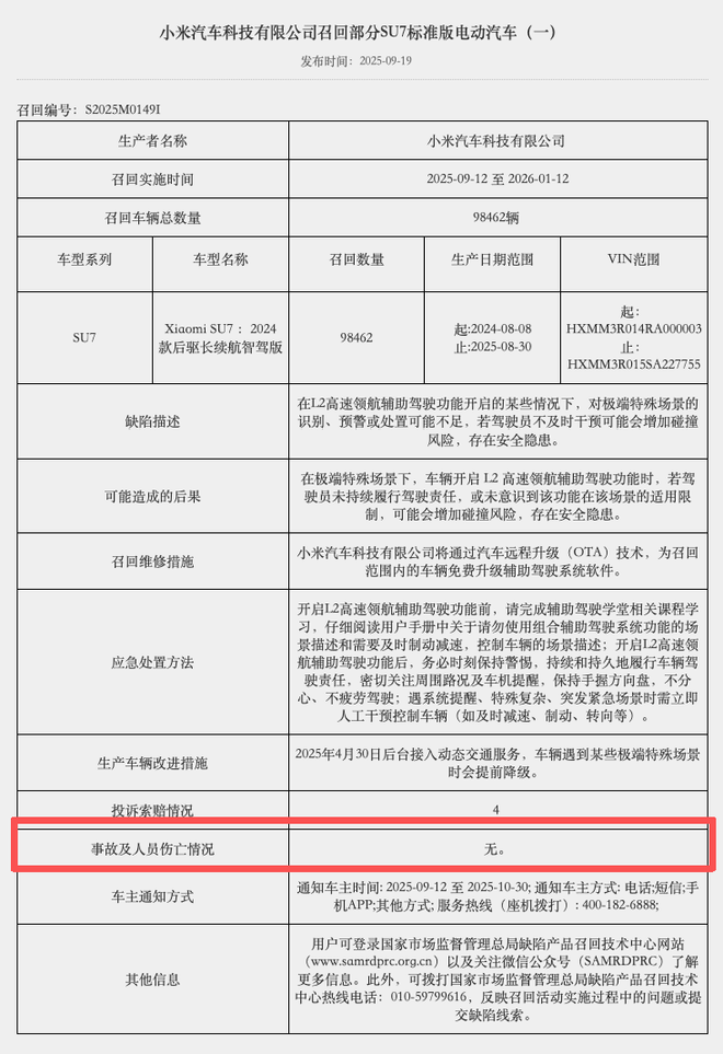 9月19日一大早,国家市场监督总局缺陷产品召回技术中心(下文简称:召回中心)公布了一则新闻——小米宣布召回11.69万辆SU7标准版。