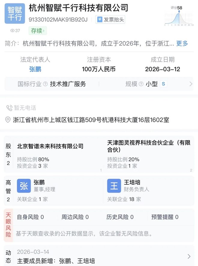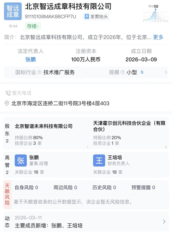 公开信息显示,“北京智远成章科技有限公司”“杭州智赋千行科技有限公司”分别成立于上个月9日和12日。表面上看,这是一次常规的工商注册,但解构其股权结构不难发现,这更接近一次组织层面的调整。
