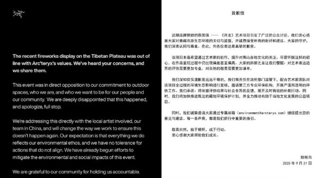 9月20日,户外品牌始祖鸟联手以火药爆破作品成名的艺术家蔡国强,在喜马拉雅山放烟花的事件,引发争议。21日,始祖鸟在海内外分别致歉。值得注意的是,两则道歉声明内容并不一致。