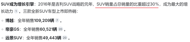 吉利此前的销量主力是轿车,但在"得SUV者得天下"的大背景下,SUV市场的爆发成为本轮股价上涨的最直接催化剂。2016年2月,吉利SUV市占率仅为0.58%,到2017年4月已飙升至5.85%,是14个月前的10倍。2017年全年,吉利SUV销量达63.3万辆,同比大增168.8%,占其总销量的比重从2016年的30%跃升至50.72%。