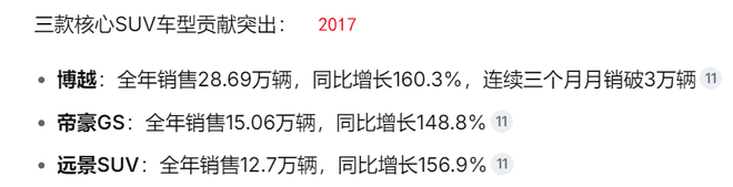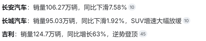 2017年,"自主三强"中长安汽车和长城汽车均出现不同程度的下滑,而吉利逆势增长63%,形成鲜明对比: