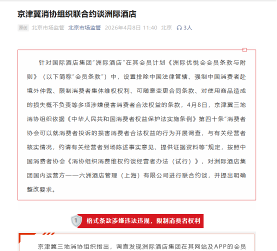 京津冀消协组织联合约谈“洲际酒店”,其会员条款侵害消费者权益