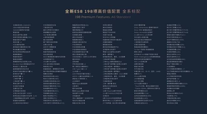 蔚来也终于懂得“把肉放在饭上”,在ES8发布会上直接列出198项全系标配的配置,给人一种买到就是赚到的既视感。