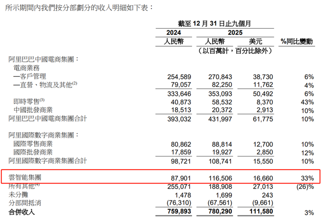 IDC发布的《中国金融云市场(2025上半年)跟踪》报告数据显示,报告期内,阿里云在金融公共云基础设施市场以43%的份额领先,创历史新高。反映到业绩表现上,2025年(截至12月31日止9个月),阿里云智能集团累计收入1165亿元,同比增长33%。