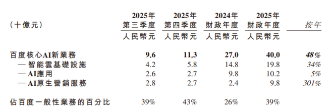 这一年,百度最底层的搜索业务加速AI转型,截至2025年10月,约70%的移动搜索结果页面包含AI生成的内容。伴随着这轮调整,2025年第三季度,百度首次披露了AI业务的详细收入,而在Q4及全年财报中,公司更将智能云基础设施、AI应用、AI原生营销服务合并为独立版块——“百度核心AI新业务”,2025财年,该业务收入400亿元,同比增长48%,在百度一般性业务中占比39%。
