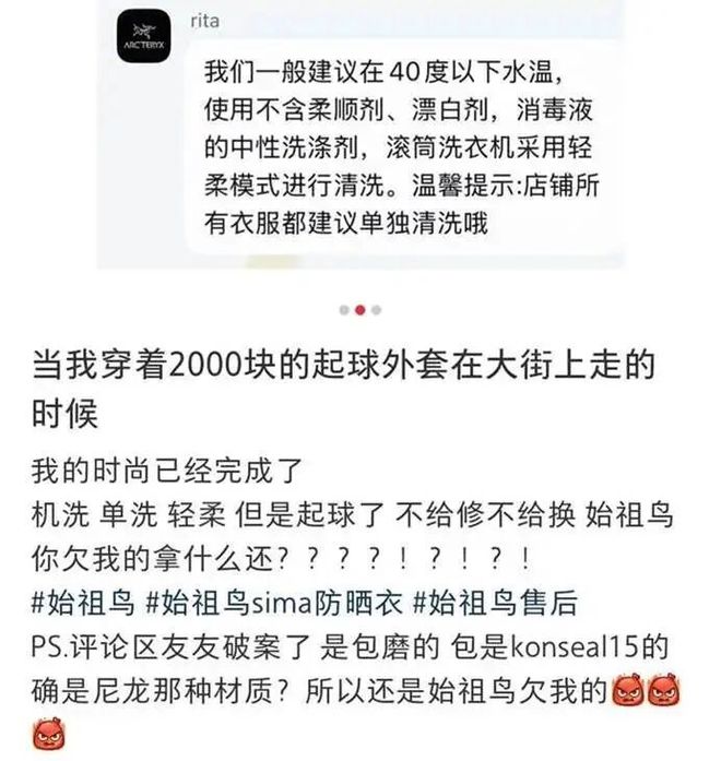 除环保争议外,始祖鸟近年来的产品质量与售后服务也引发了众多消费者的不满。