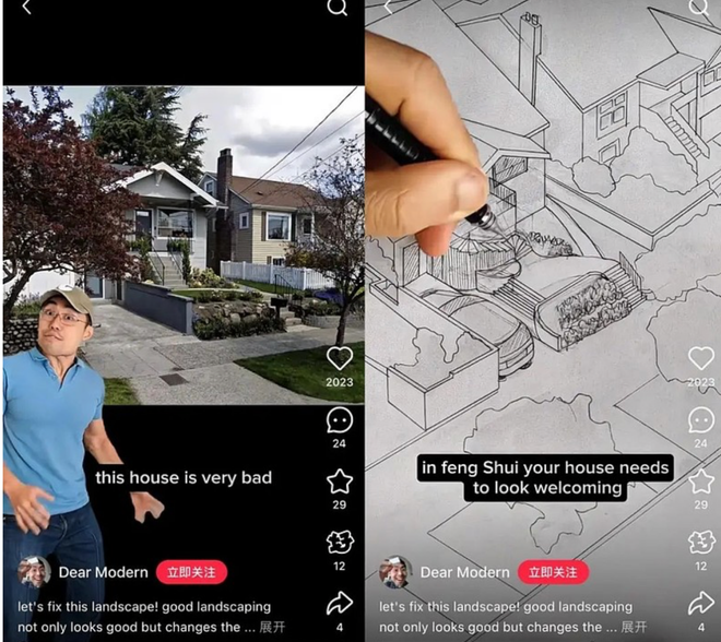 美籍华人Dear modern便是这一策略的受益者。他原本只是一位普通的家居设计师,在社交平台分享设计作品却反响平平。直到他开始用中国风水理念改造房屋,并详细讲解房门朝向、院墙修建、家具摆放对主人运势的影响,迅速引发海外网友关注,如今粉丝已突破330万。