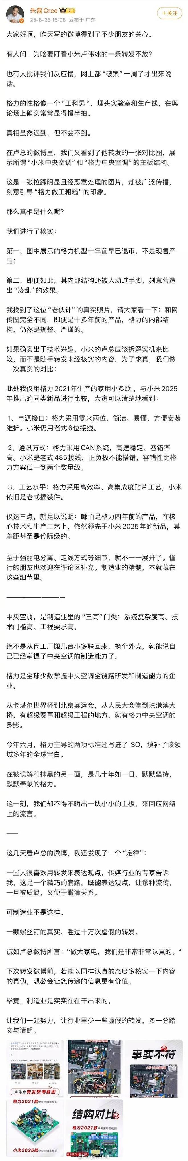 另外,格力则以技术壁垒展开反击。朱磊在微博中晒出格力2021年产品与小米2025年新品的对比图,宣称存在"代际级差距",并质疑小米转发的主板对比图"恶意处理",将十年前退市机型伪装成当前产品。