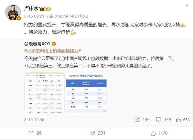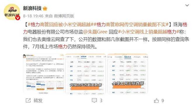 小米总裁卢伟冰随即转发称"能力的坚实提升,才能赢得高质量的增长",公关总经理王化更感慨"新时代这么快就来了"。三天后,格力市场总监朱磊晒出截然不同的数据:格力线上份额16.41%,小米以13.50%居第三,直指对方数据"来路不明"。