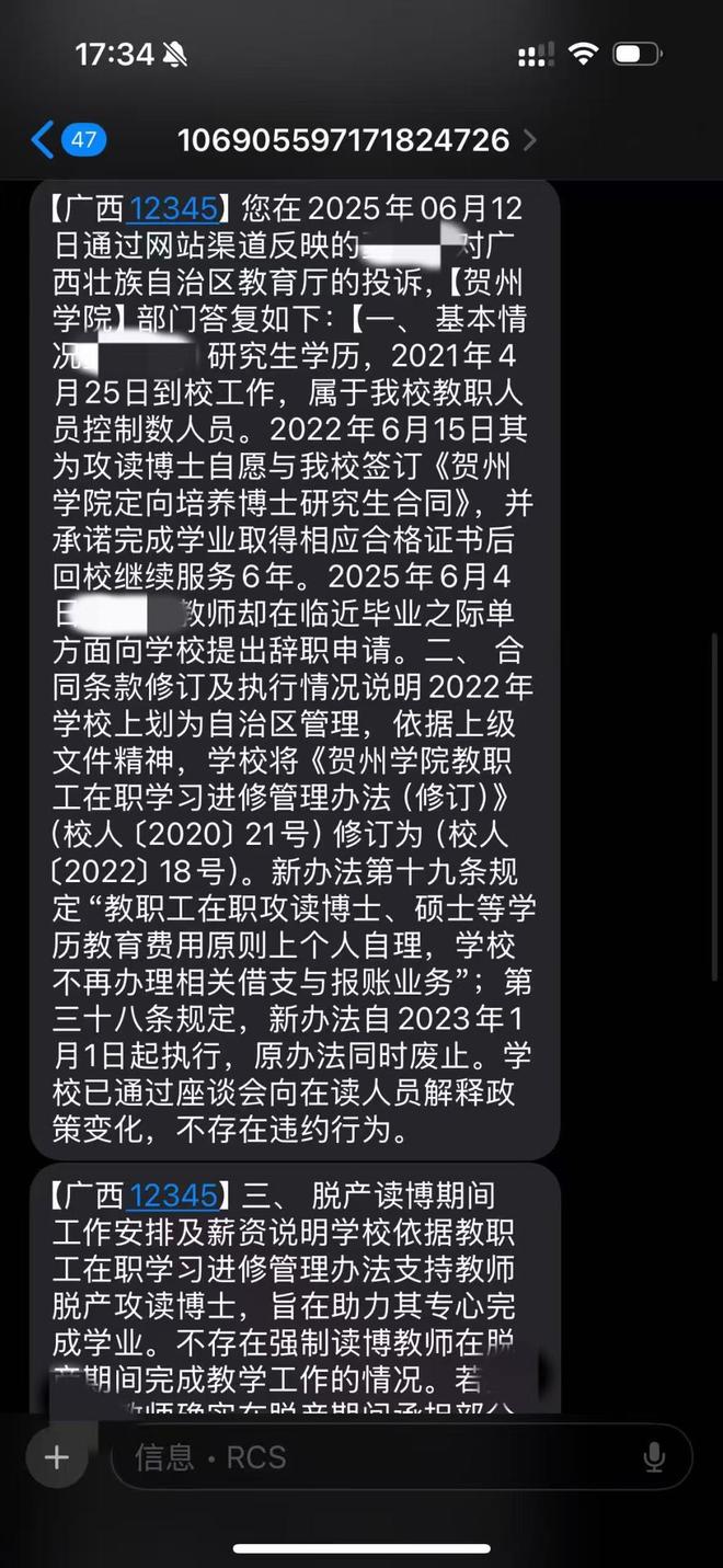 澎湃新闻注意到,在12345回复中,贺州学院称,2022年,贺州学院划归自治区管理,修订了《贺州学院教职工在职学习进修管理办法》,新办法第十九条规定“教职工在职攻读博士、硕士等学历教育费用原则上个人自理,学校不再办理相关借支与报账业务”,新办法自2023年1月1日起执行,原办法同时废止、学校已通过座谈会向在读人员解释政策变化,不存在违约行为。此外,贺州学院不存在强制读博教师在脱产期间完成教学工作的情况,若夏荷确实在脱产期间承担了部分教学工作,学校已按照工作量发放绩效工资,要求其退还的工资不包含此部分绩效。