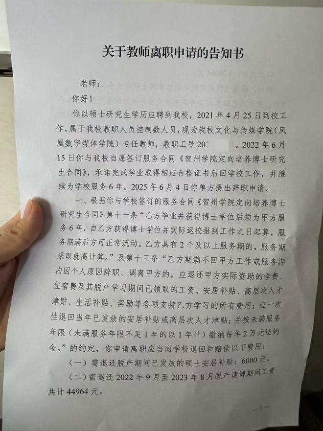 4年前,夏荷(化名)入职广西贺州学院成为一名青年教师;工作一年后,在学校的支持下,夏荷选择了在职读博;今年5月,临近博士毕业,夏荷提出辞职,被学校索赔17万元。