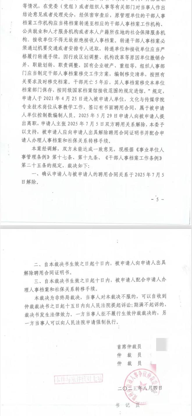 贺州市劳动人事争议仲裁委员会出具的仲裁结果显示,双方聘用关系于今年7月5日解除,贺州学院应向夏荷出具解除聘用合同证明书并配合其办理人事档案和社保关系转移手续。