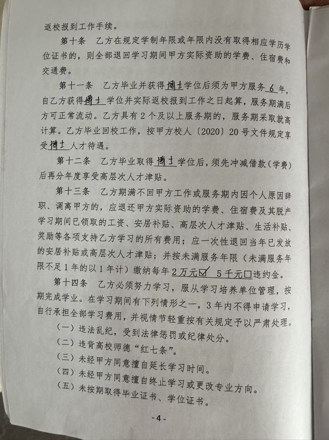 读博前,夏荷和贺州学院签订的《贺州学院定向培养博士研究生合同》约定,夏荷获得博士学位后,需为贺州学院服务6年,服务期满后方可正常流动,若违约需退还贺州学院相关费用并支付违约金。