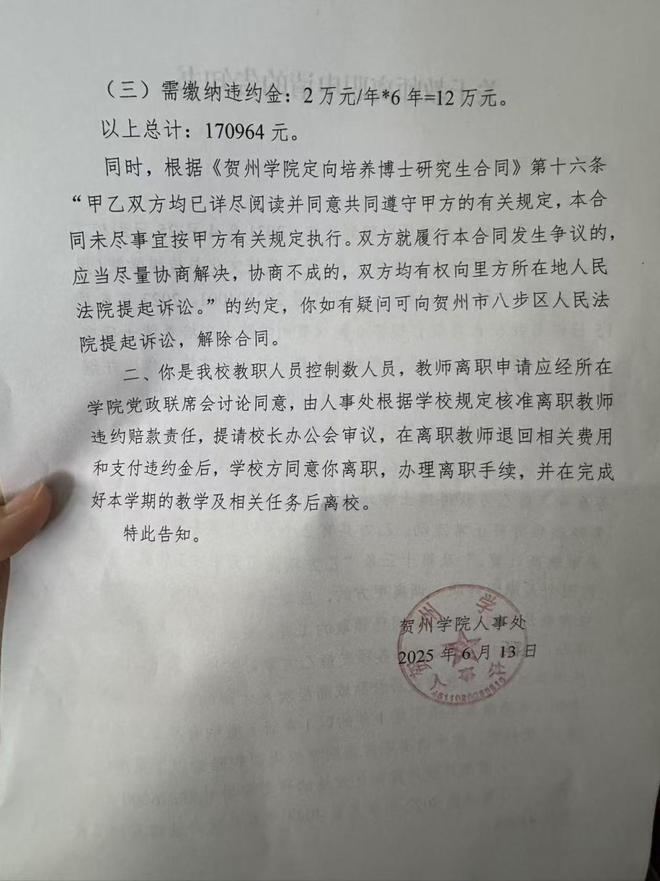 贺州学院称,待夏荷退回相关费用、支付违约金,并完成本学期教学及相关任务后,学校将办理离职手续和人事档案转递。
